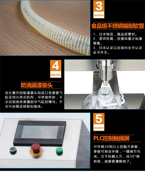 該款半自動(dòng)食用油灌裝機(jī)采用電氣結(jié)合的方式,兩個(gè)灌裝頭分別有兩個(gè)不銹鋼離心泵來(lái)控制,做到了單頭單泵的灌裝,壓力恒定,流量更穩(wěn)定,單頭則可直接修改誤差,以保證1%的灌裝精度;1-20L大容量灌裝范圍,滿足您多種灌裝規(guī)格的需求;別看設(shè)備小屬于半自動(dòng)食用油灌裝機(jī),但是在細(xì)節(jié)設(shè)計(jì)上更是精準(zhǔn),有用的真空回吸灌裝頭可進(jìn)口亞德客氣缸采用分體式機(jī)構(gòu),可單獨(dú)拆卸,不會(huì)出現(xiàn)液體滲漏損壞氣缸的情況,而且不會(huì)污染輸送鏈板和瓶體。細(xì)節(jié)上和全自動(dòng)食用油灌裝機(jī)相比是絕不服輸。存在的PLC控制觸摸屏則更是包含了全自動(dòng)食用油灌裝機(jī)的功能設(shè)置參數(shù),禮遇機(jī)上成30°傾斜角,觀察更加清晰明了。